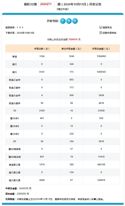 2024年10月11日,3D游戏第2024271期开奖,3D游戏派奖活动的第六期,当期中奖号码为795。