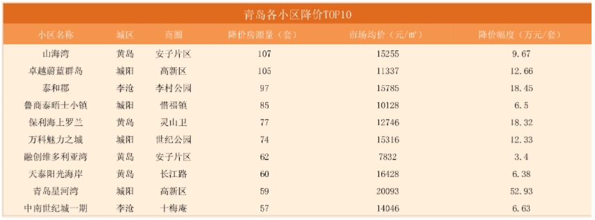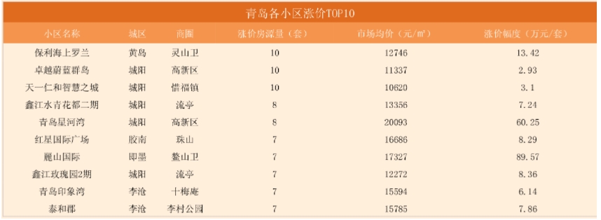 青岛二手房小区涨降价TOP10名单公布,保利海上罗兰小区涨价房源量居首,山海湾降价房源量居首。