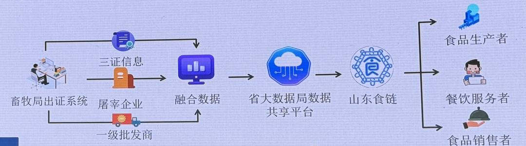 据介绍,2022年,山东省市场监管局建成“山东食链”平台,推动食用农产品和食品信息化追溯。今年8月,山东省畜牧兽医局检疫和检验无纸化出证系统,实现生猪产品“三证联通”。目前,两部门正在进行系统升级工作,将通过省大数据局数据共享平台实现系统连通,使畜牧部门“三证”数据接入“山东食链”,贯通生猪数据全链条。届时,“山东食链”为每个肉类业户生成的主体二维码,均可实现每批生猪产品的“三证”和追溯信息扫码可查。