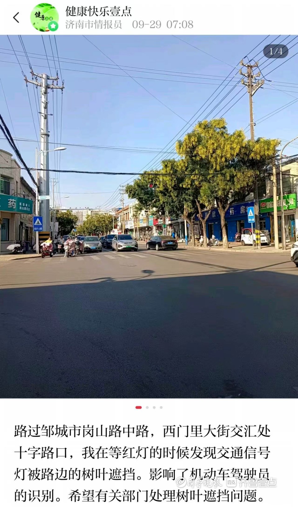 9月29日,情报员向齐鲁壹点情报站发来一则报料, 路过济宁邹城市岗山路中路,西门里大街交汇处十字路口,发现交通信号灯被路边的树叶遮挡,影响了机动车驾驶员的识别,希望有关部门处理树叶遮挡问题。