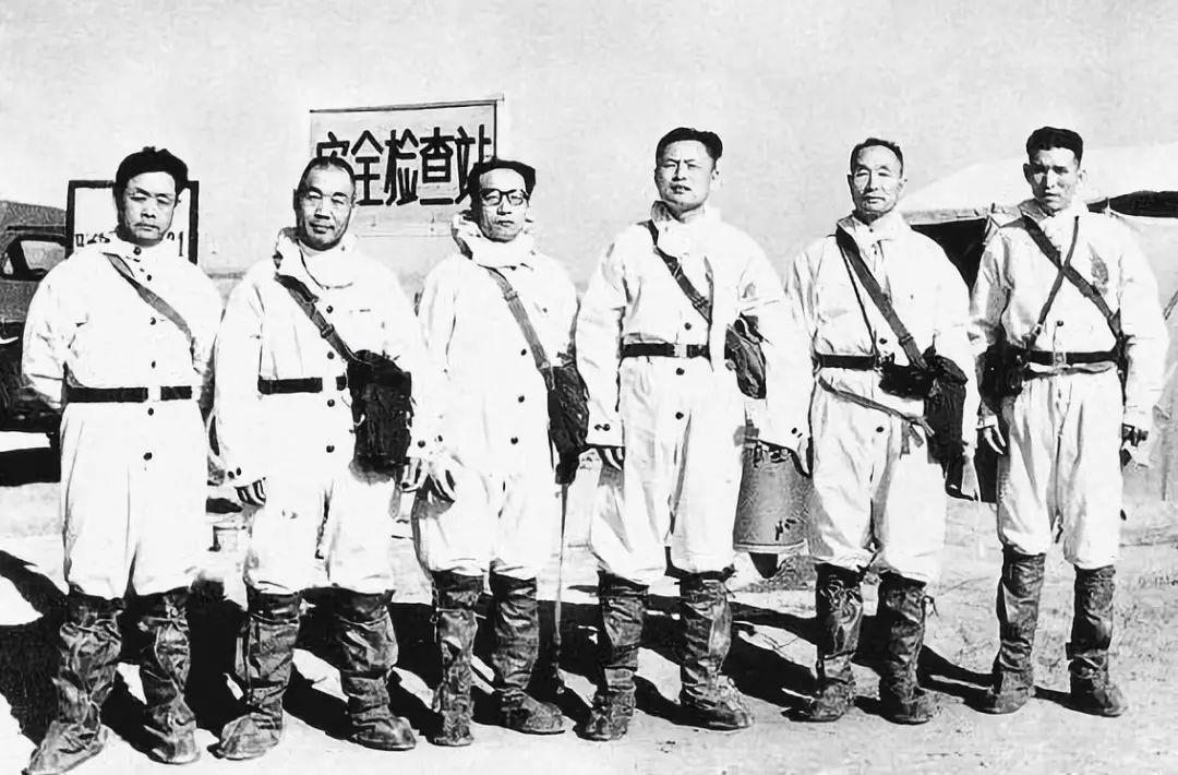 △第一次原子弹试验的前线指挥部部分领导:(右至左)毕庆堂、张爱萍、刘西尧、刘柏罗、张蕴钰、苑华冰