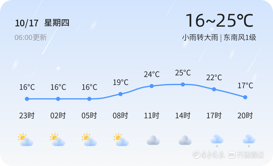 【今日天气】2024年10月17日,农历九月十五,济南迎来小雨转大雨的天气,气温在16℃至25℃之间波动,东南风1级,空气湿度达到79%,但空气质量因PM2.5值达到100而显示为轻度污染。市民出行请携带雨具,注意防范雨水带来的不便,并尽量减少户外活动,以免受到空气污染的影响。