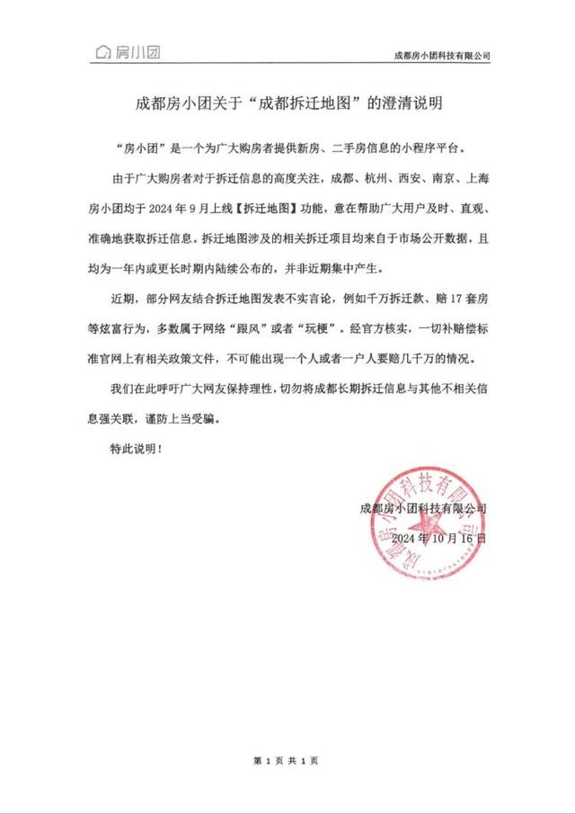 据四川日报报道,10月16日,针对网上流传的成都拆迁地图,地图发布方“房小团”作澄清说明,拆迁地图涉及的相关拆迁项目均来自于市场公开数据,且均为一年内或更长时期内陆续公布的,并非近期集中产生。