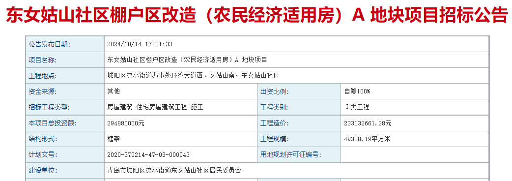 建面 49308.19 平方米!城阳东女姑山社区棚户区改造(农民经济适用房)A 地块招标