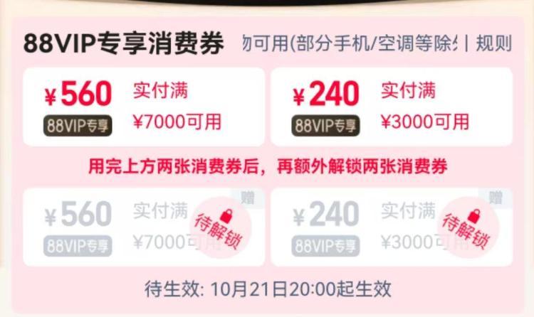 “简直是在考察我的计算能力。”她以在淘宝平台购买美妆等产品为例:“88VIP的会员可以领取两轮满7000减560元、满3000减240元的消费大额券,一般一次购物需要正好凑到3000元。像美妆品类券是满2000减280元,生活用品类券是满200减20,我就会选择购买2000元的美妆产品,再叠加1000元生活用品等类目的产品一起下单。”