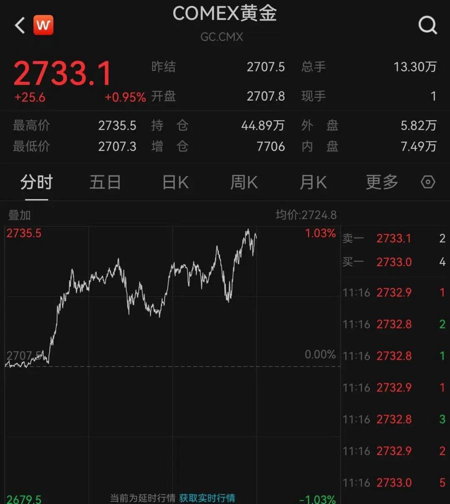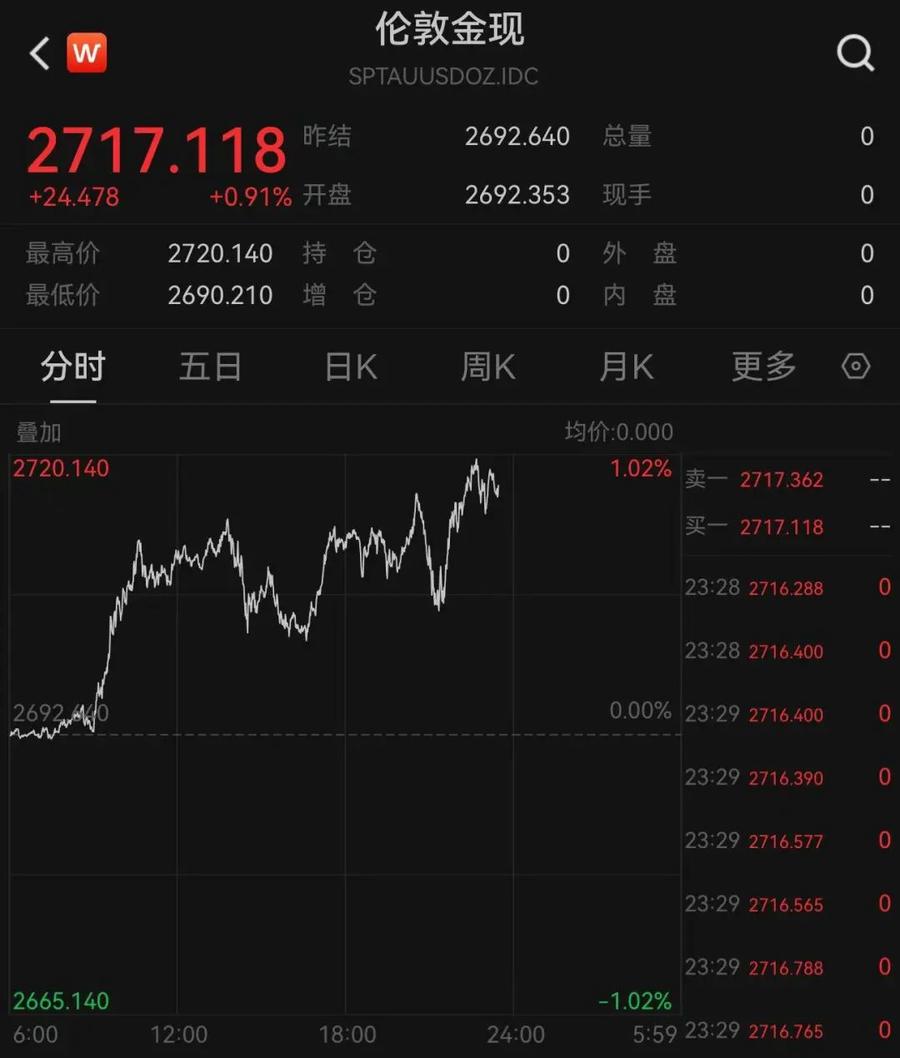 截至10月18日23时,伦敦黄金现货价格徘徊在2717美元/盎司附近,盘中一度创下历史新高2720.140美元/盎司。COMEX黄金期货价格一度达2735.5美元/盎司。