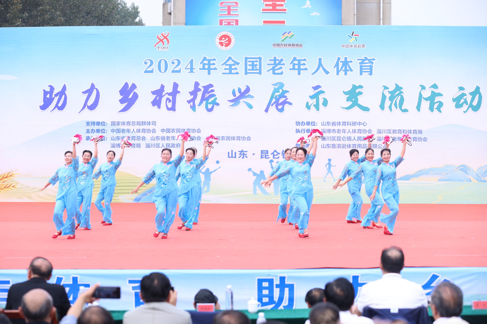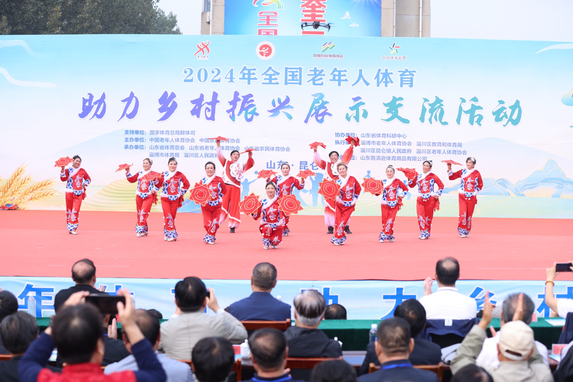 10月16日,2024年全国老年人体育助力乡村振兴展示交流活动在淄博市淄川区昆仑镇开幕。全国12个省区市的16支队伍受邀进行展示交流。开幕式上,作为全国受邀展示交流的16支队伍之一,来自淄川区昆仑镇三台村的展演队伍登台演出。