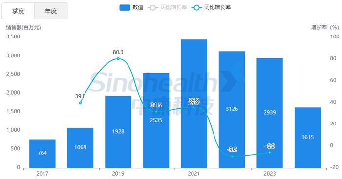 盐酸多柔比星脂质体注射液在全国等级医院销售情况统计 图片来源:中康科技