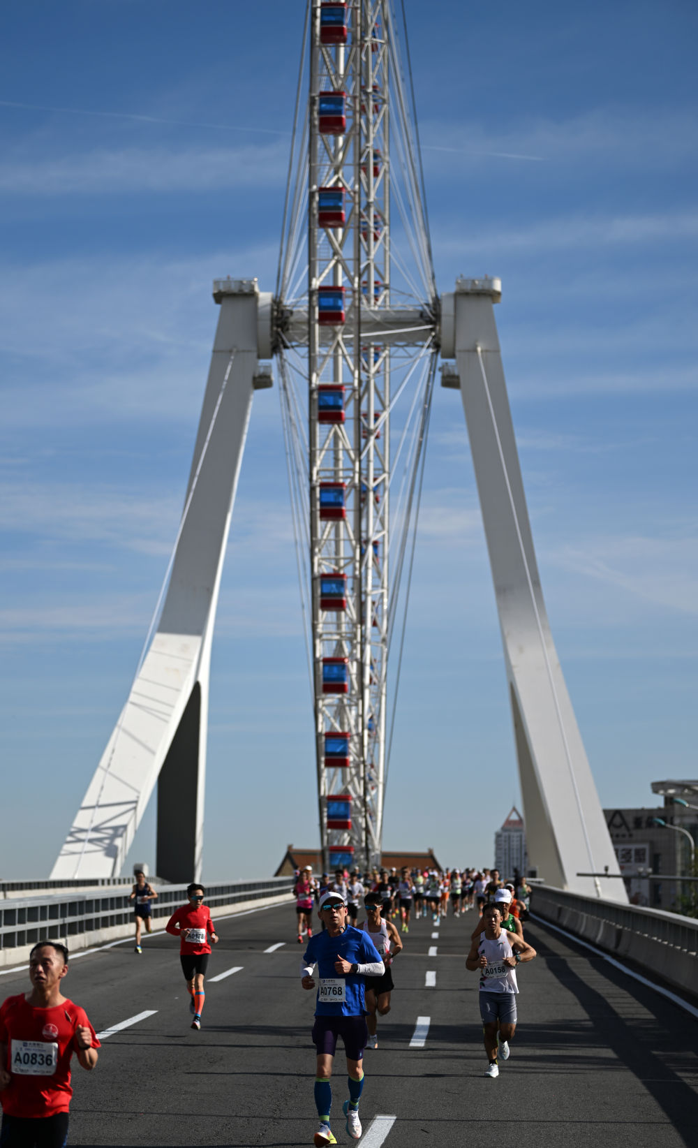 10月20日,参赛选手在天津马拉松比赛中经过“天津之眼”摩天轮。新华社记者 李然 摄