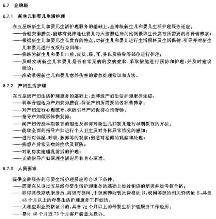 《家政服务母婴生活护理服务质量规范》中对于“金牌级”从业人员的要求