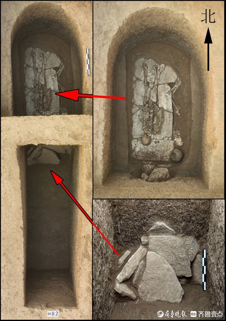 M82为土洞墓,南北走向,全长4.6米,墓道朝南,竖井式墓道,底部为斜坡状,长约2.4米,石板封门。墓室狭长,南北走向,西部三分之二以大块石板南北通铺石床,东侧留缺。葬二人,头向南,西侧墓主正置于石床之上,仰身直肢,东侧墓主仰身、下肢侧屈向东侧墓主。