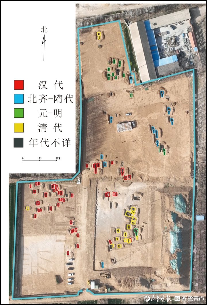 此次发掘墓葬数量较多、年代较广,据墓葬分布及随葬品情况判断,这批墓葬应为四处时间上相互独立的中小型墓地。汉代墓葬年代较为接近,分布较为集中,出土随葬品及墓葬形制具有较鲜明的特点,为探索鲁中地区汉代墓葬形制及陶器形态演变提供了新的材料,具有较高的历史研究价值。北齐-隋时期墓葬出土一批早期青瓷,墓葬保存较好,随葬品较为典型,为该时期墓葬形制、葬俗及山东地区制瓷业研究增添了一批新的材料,具有较高的科学、历史研究价值。元明时期及清代墓葬数量较多、排列紧密有序,为济南地区同时期中小型墓葬形制、民俗研究提供了新的参考。