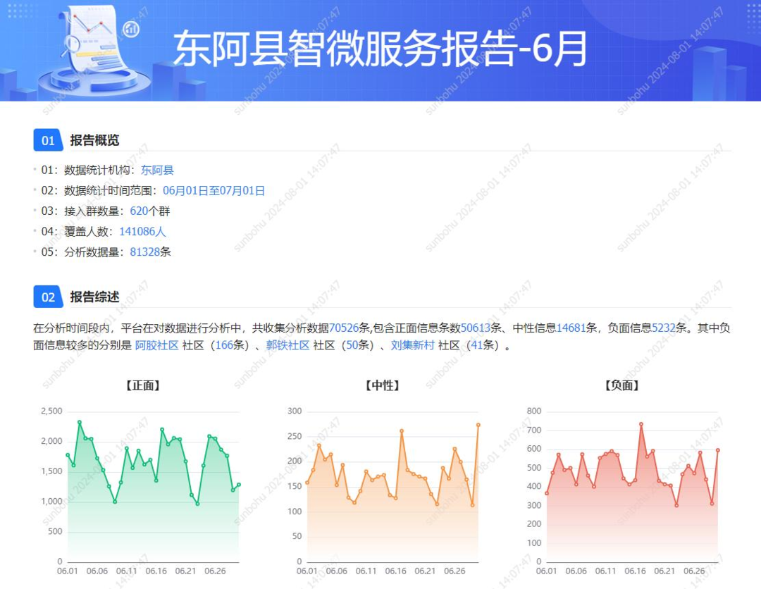 “1月份至今,东阿县AI数字网格接入620个网格化工作微信群,覆盖户数14万余户,链接便民服务事项办事指南2000条左右,智能分析中性信息150000余条,负面信息50000余条,生成工单1296个,解决问题1000余件,群众急难愁盼问题基本实现了快速高效解决。”谈到“AI数字网格员”为基层治理带来的变化,东阿县委政法委相关负责人说。