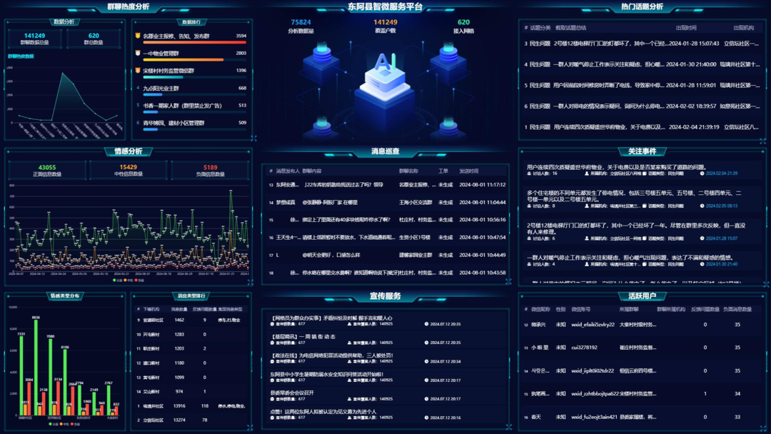 目前,东阿县各网格化工作微信群已全部接入AI数字网格系统,按着信息抓取分析、问政解答和宣传提示功能,能够实现群众需求的精准反馈;社保医保、创业就业、教育考试、市场监管、助残服务等多领域便民服务的融合,打破了信息壁垒,实现了统一处置反馈。通过数据资源整合后,将为全县的智能化治理提供准确、全面、实时的数据支撑,有效拓展了矛盾纠纷线索来源渠道,破解基层安全隐患发现难、矛盾纠纷预防难、社会管理漏洞多社会基层治理的堵点和难点问题,实现了聊城“智慧政法”让数字“活”起来、信息“联”起来,网格“动”起来的“智治”目标,使社会基层治理更精准、防控更精密、服务更精细,数字赋能政法工作现代化,加速了网格化基层治理的转型升级。