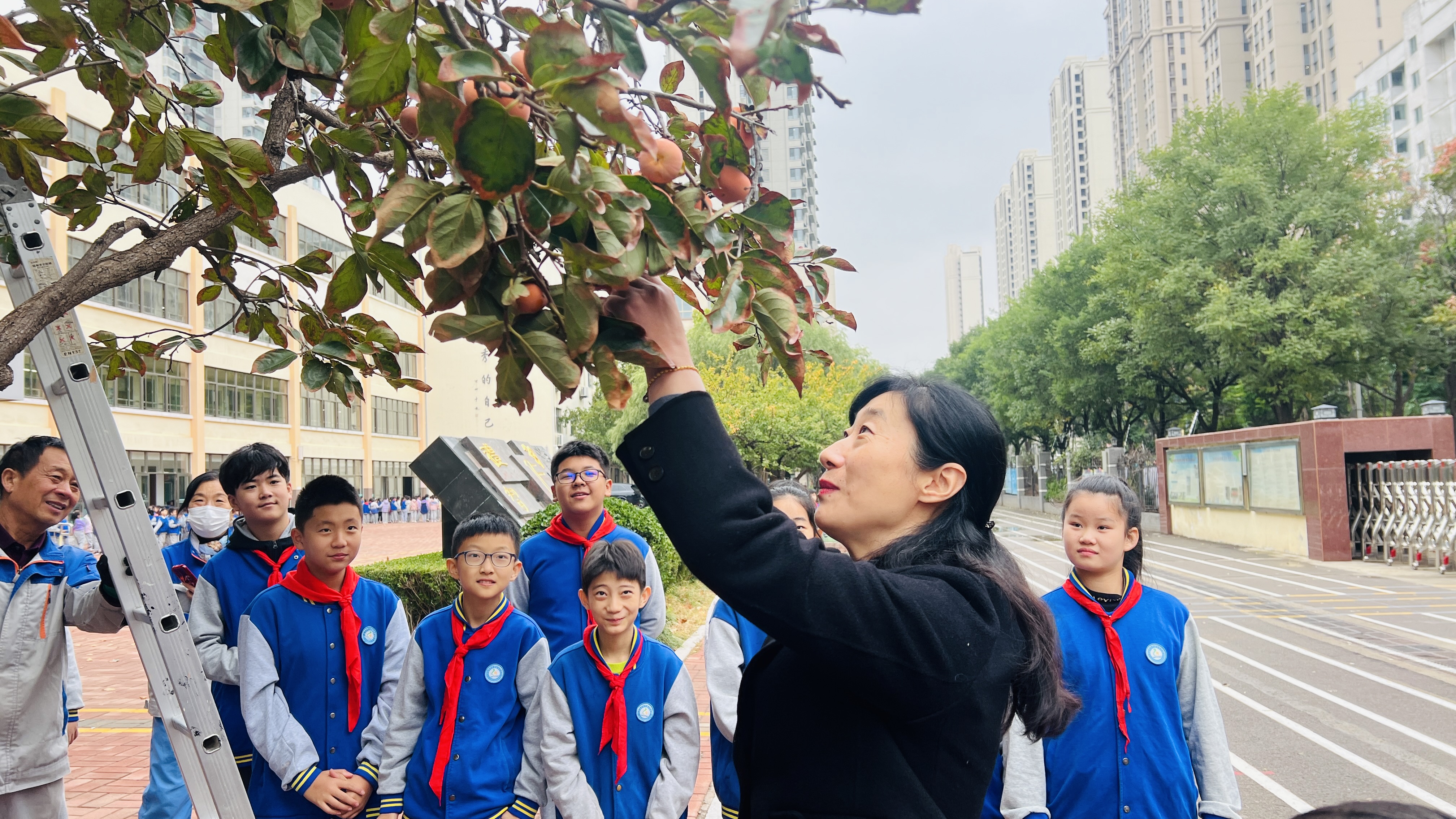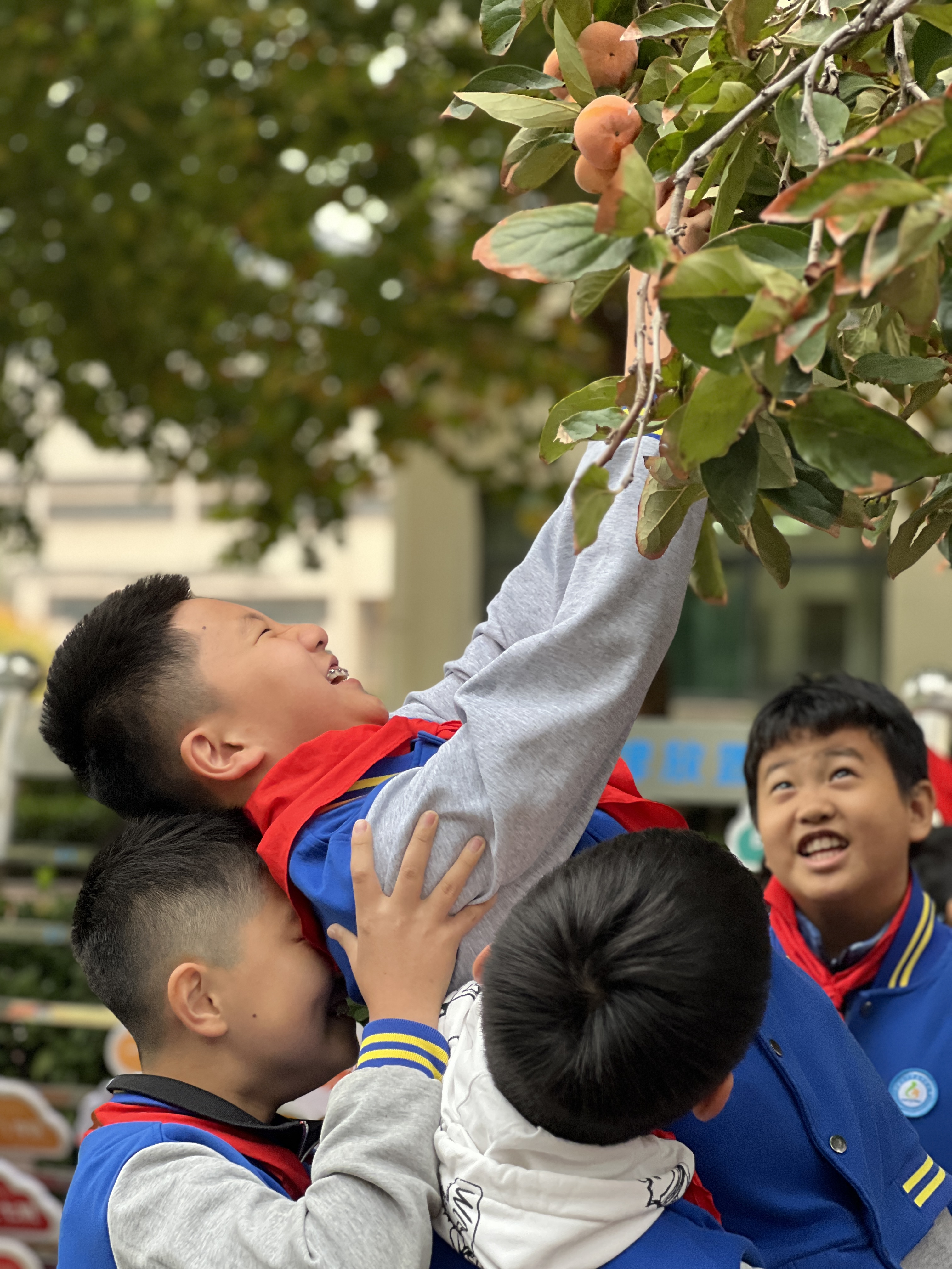 校长摘下第一颗柿子之后同学们就热火朝天地干起来了。大家互相帮助,共同协作,不仅摘下了许多红彤彤的柿子,还收获了珍贵的友谊和团队精神。他们踮起脚尖、攀爬梯子,甚至跳起来去够那些高处的柿子,现场充满了欢声笑语。