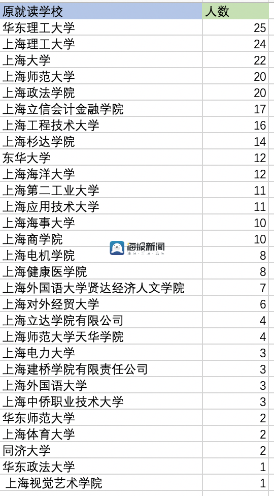 从原就读学校来看,这281名插班生分别来自29个学校。其中原就读于华东理工大学的人数最多,为25人;原就读于华东政法大学和上海视觉艺术学院的人数最少,各为1人。