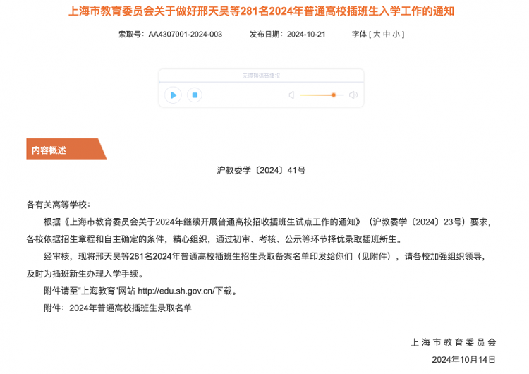 近日,上海市教委公布了2024年普通高校插班生录取名单:经过初审、考核、公示等环节,择优录取281名2024年普通高校插班生。