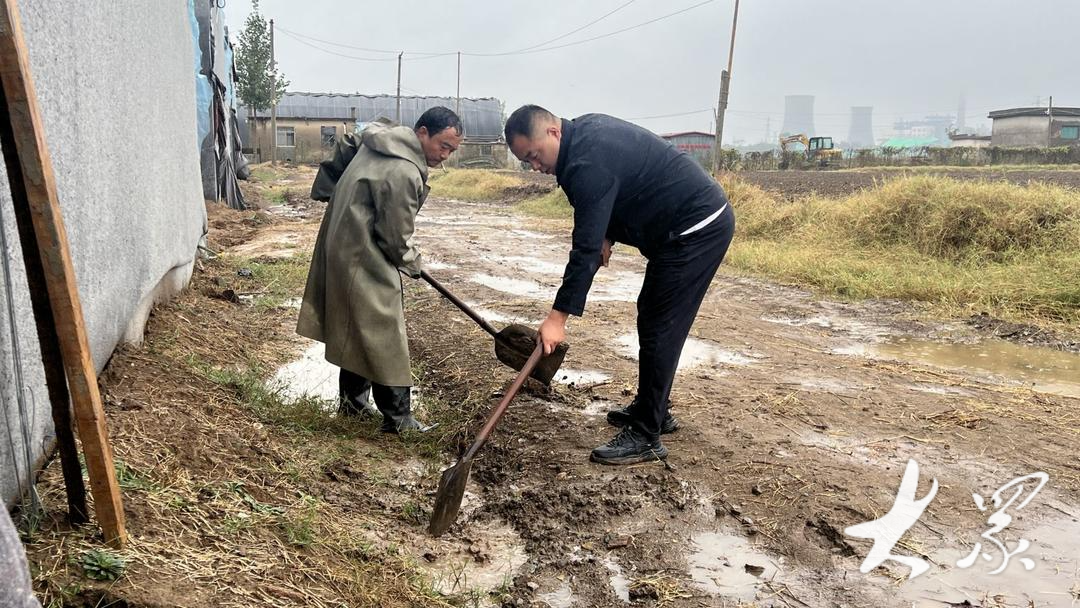 吴洪振与村两委干部清理大棚外淤泥。