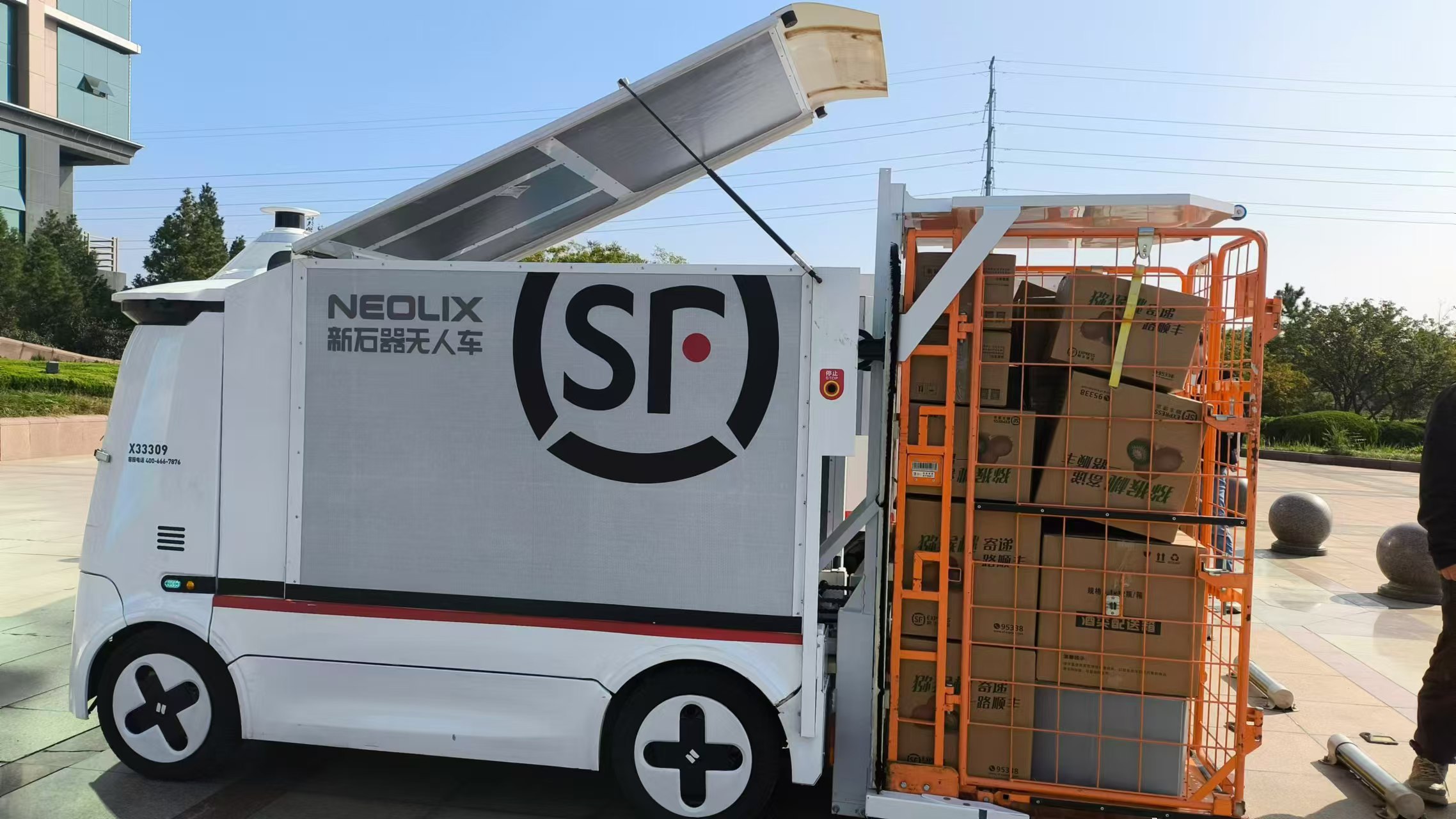 “这款无人配送车装载空间3立方米,载重500公斤,单车单次装载快递200-300件,续航里程100公里,具备在城市公开道路场景下50km/h的完全自动驾驶能力,能够满足半径10公里的城市末端配送需求,凭借提频发运和灵活串点等优势能够大幅度降低接驳成本,提升派送时效20%-30%。”新石器慧通(北京)科技有限公司项目交付经理孔双超介绍。