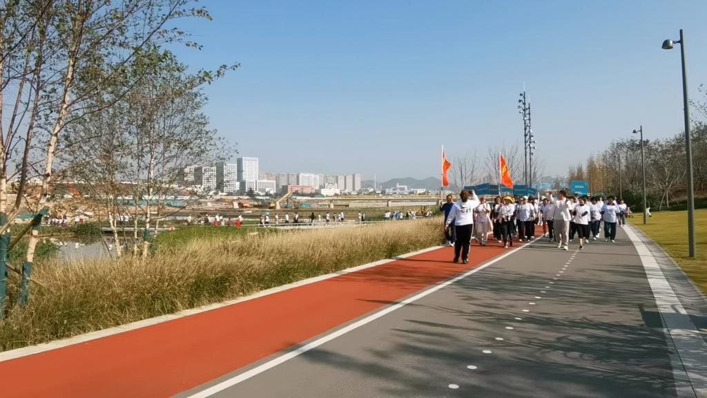 当天的健步行也不分啥输赢,关键就是让大家沿着张村河绿道走一走。刚出发时,队伍还比较紧密地往前推进,走着走着,有的居民慢下脚步欣赏风景,有的三五成群不紧不慢聊着天,有的跑到一边去拍照,队伍开始松散开。