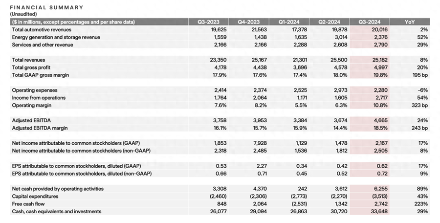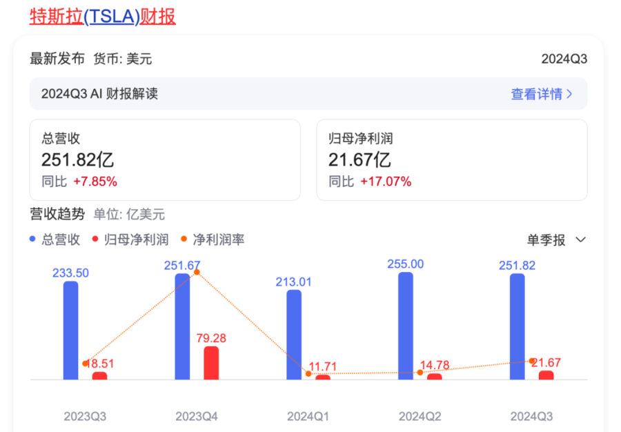 10月23日,特斯拉对外公布2024年第三季度财报。数据显示,2024年第三季度特斯拉营收为252亿美元(约1795.7亿元人民币),同比增长8%,环比下滑1.2%;净利润为21.7亿美元,同比增长17%,环比增长46.6%,增速尤为明显;非GAAP净利润为25亿美元(约合178.1亿元人民币);毛利润为49.97亿美元,同比增长20%;毛利率为19.8%,高于第二季度的18%以及去年同期的17.9%。