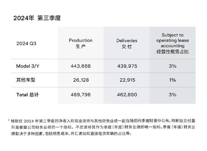 目前汽车业务仍是特斯拉公司的支柱产品,今年第三季度该业务营收为200.16亿美元,同比增长2%。新车产销方面,第三季度特斯拉全球累计生产46.98万辆汽车,其中,Model 3和Model Y累计产量为44.37万辆;全球累计交付46.29万辆汽车,同比增长6.4%,环比增长4.3%,创2024年季度交付新高,其中,Model 3和Model Y累计交付44.00万辆。
