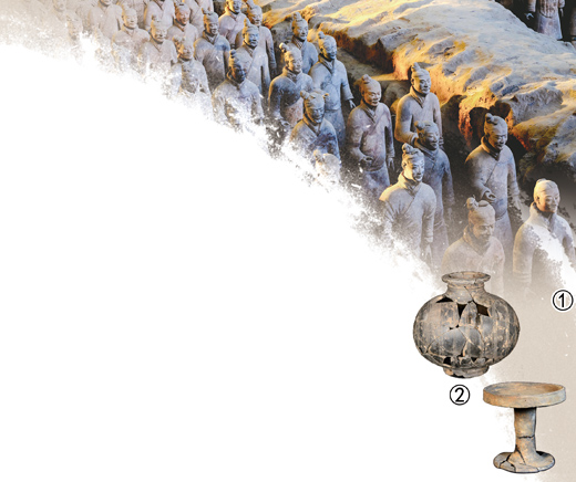 图①:兵马俑一号坑。图②:秦始皇陵西1号墓出土陶器。