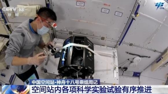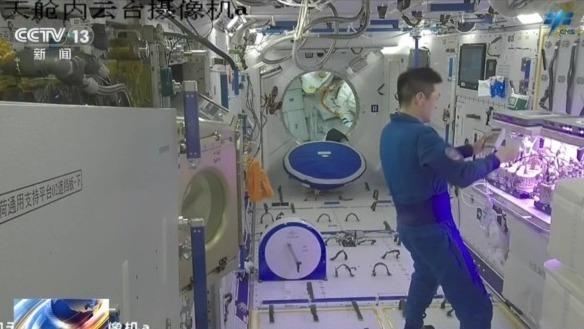 国家太空实验室内,空间材料科学、微重力流体物理与燃烧科学等领域实验持续开展,乘组按计划进行了燃烧柜气体实验插件燃烧器更换、流体物理实验柜实验样品更换。
