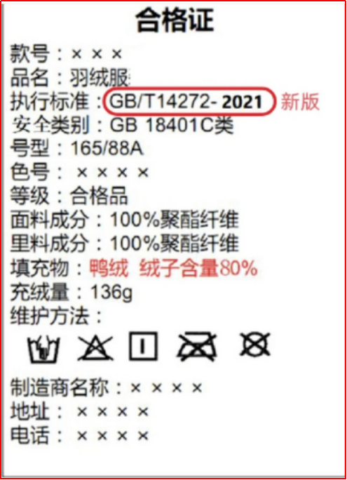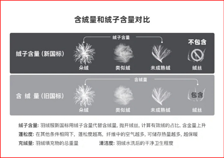 《羽绒服装》新国标用“绒子含量”替代了旧国标的“含绒量”。如果羽绒服上没有标明'绒子含量“四个字,那说明它很可能是存货。新国标还规定,羽绒服绒子含量不低于50%,在羽绒服中实际发挥保暖作用的是“绒子”,绒子含量越高保暖性相对越好,新国标可以更直观地判断羽绒服的保暖功效和羽绒品质高低,避免了厂家拿羽绒废料以次充好。