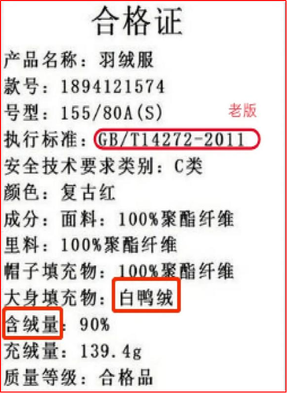 消费者在选购羽绒服时,一定要注意查看产品使用说明(吊牌)是否完整、准确,至少应包括产品名称、执行标准、安全类别、产品号型、纤维成分及含量、产品等级、制造者的名称和地址、维护方法等内容。特别应注意执行标准、填充物、绒子含量、充绒量等信息,这些是我们选购时需要重点关注的指标。