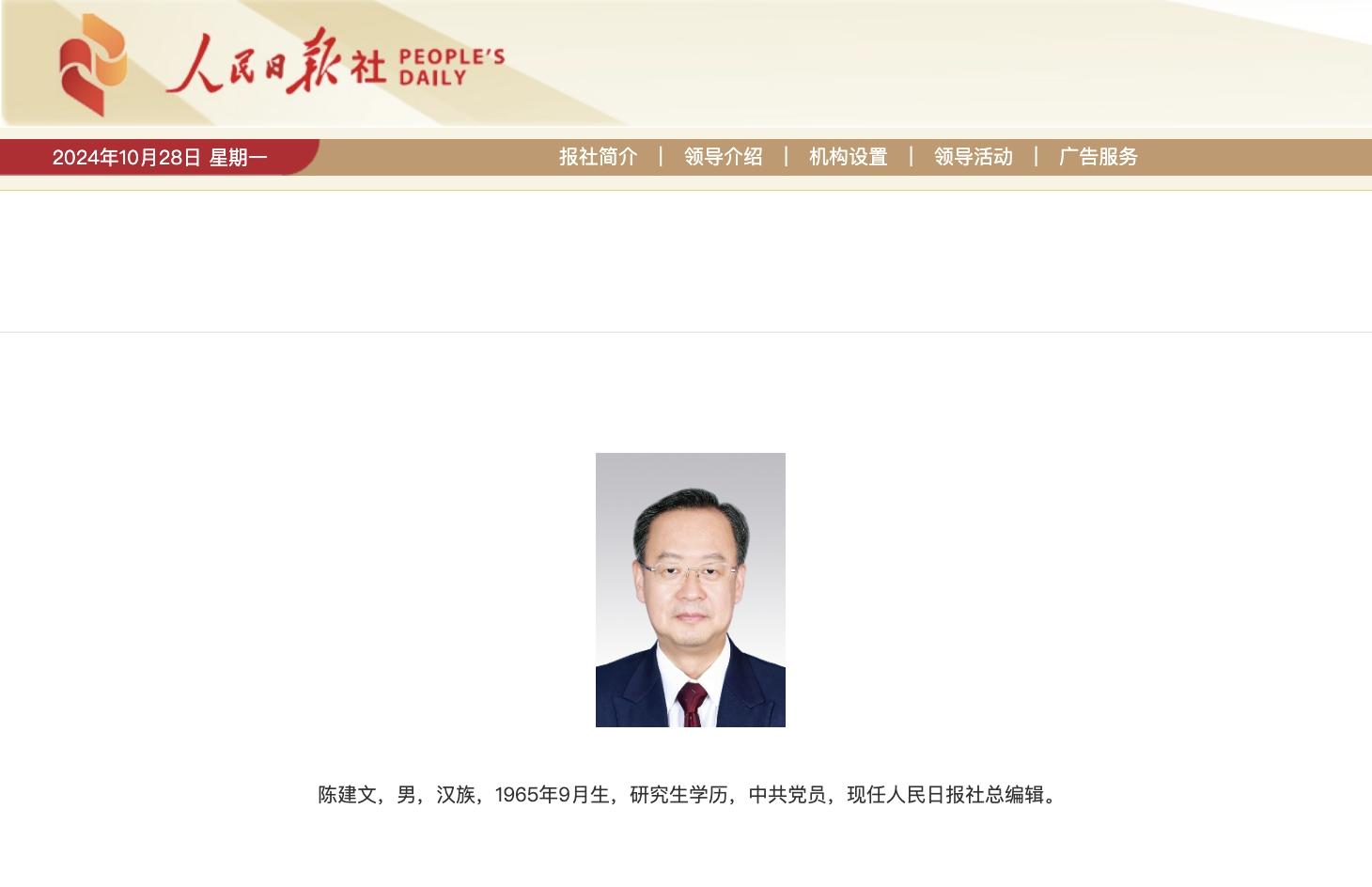官网显示,陈建文已任人民日报社总编辑,此前任广东省委常委、宣传部部长。