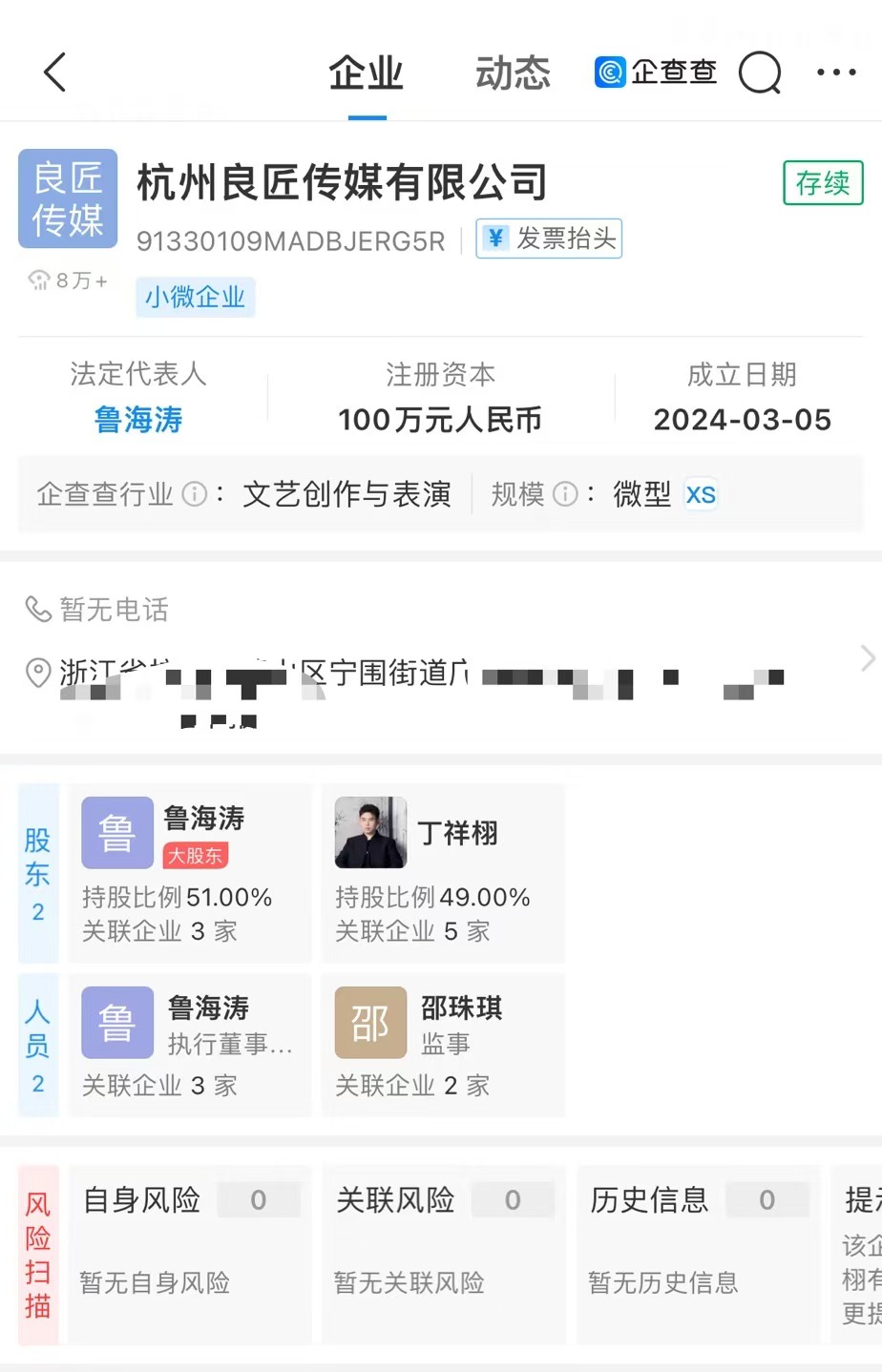 据悉,“听泉鉴宝”APP由杭州良匠传媒有限公司开发,企查查APP显示该公司成立于2024年3月,注册资本100万元,法定代表人鲁海涛,账号“听泉赏宝”的实名认证信息丁祥栩持有该公司49%股份。