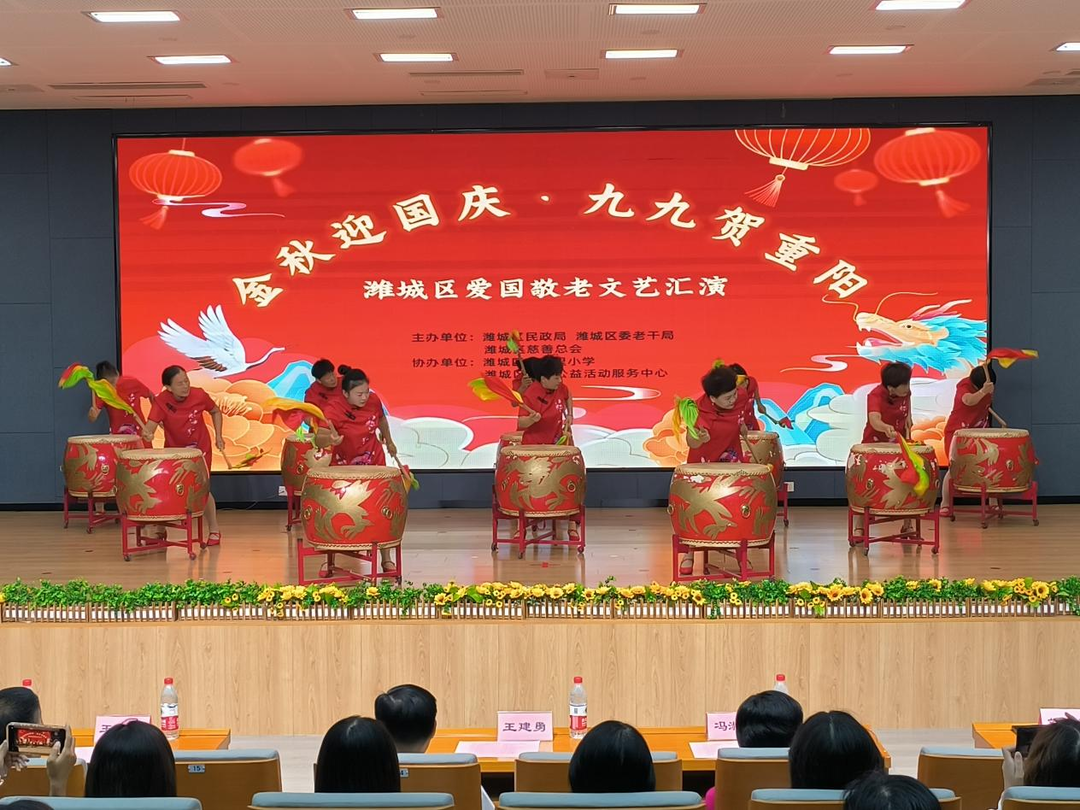 潍城区民政局联合区委老干局、区慈善总会开展“金秋迎国庆 九九贺重阳”爱国敬老文艺汇演,活动汇集了歌曲、小品、舞蹈、戏曲等13个节目,充分展示了全区老年人积极乐观、健康向上的精神风貌。各区直部门、街道(开发区和发展服务中心)、养老机构等分别组织文艺演出、健康义诊活动、走访慰问和手工制作等活动。