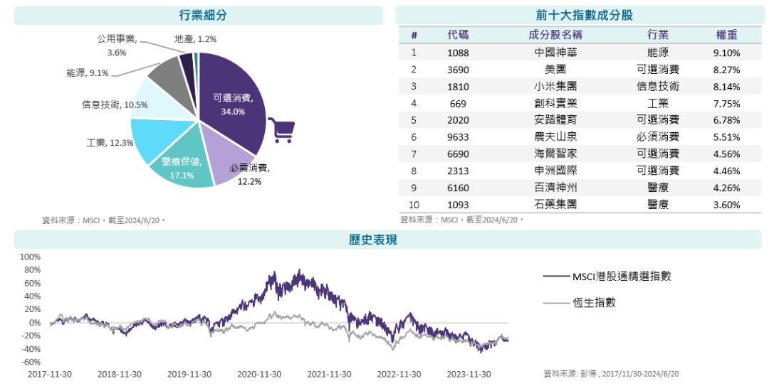 具体来看,MSCI港股通精选指数主要涵盖消费、医疗保健和科技等行业,其中可选消费占比最大,达到34%;医疗保健、工业、必需消费,以及信息技术占比均超10%。中国神华、美团、小米集团、创科实业、安踏体育、农夫山泉、海尔智家、申洲国际、百济神州、石药集团位列前十大成分股。