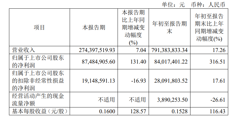 值得一提的是,该公司归属于上市公司股东的净利润8401.74万元,同比涨幅翻倍。其中,仅第三季度该公司就实现了营业收入2.74亿元,同比增长7.04%,环比下降11.25%;净利润8748.49万元,同比增长131.40%,环比增长4089.31%。
