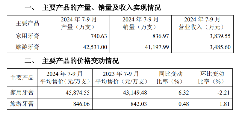 从三季度的运营数据显示,7-9月,公司家用牙膏实现营业收入3839.55万元,同比增长超过3成,旅游牙膏收入3485.60万元,同比几乎持平。此外,家用牙膏价格同比增长6.32%,旅游牙膏同比增长仅0.48%。