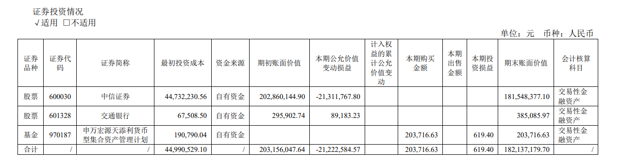 据该公司此前发布的半年报显示,截止到2024年6月30日,两面针持有中信证券、交通银行两只股票以及申万宏源天添利货币型集合资产管理计划一只基金。并持有柳州银行和广西北部湾银行部分股权。