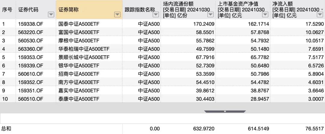10月30日,10只中证A500ETF净流入76.6亿元,创上市以来单日新高,其中国泰基金、 摩根资产管理、富国基金旗下中证A500ETF净流入超10亿元,国泰基金、富国基金、摩根资产管理、华泰柏瑞基金、景顺长城基金、银华基金、招商基金、南方基金旗下中证A500ETF当日净流入额集体刷新上市以来单日纪录。当天净流入居前的十只ETF中,中证A500ETF占了八席。