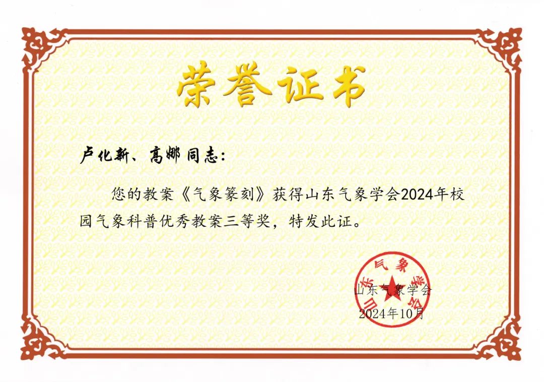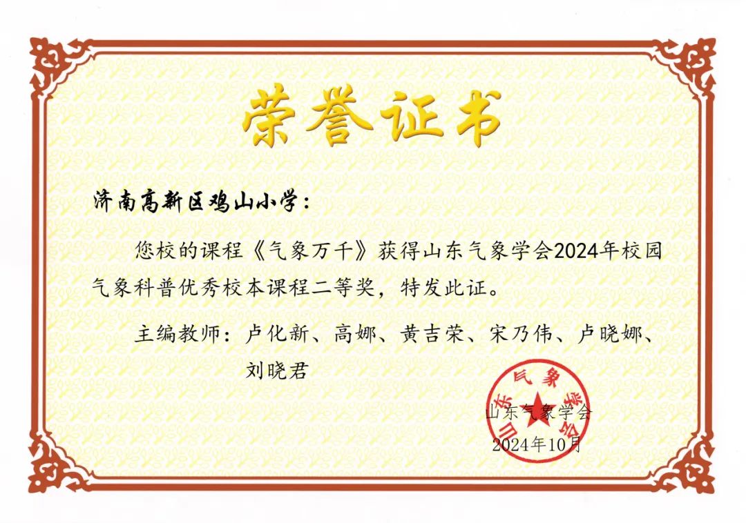 近日,山东气象学会举办2024年校园气象科普教程设计交流会,根据各单位汇报交流情况,共评选出优秀校本课程和优秀教案各4个,济南高新区鸡山小学三份作品入选。