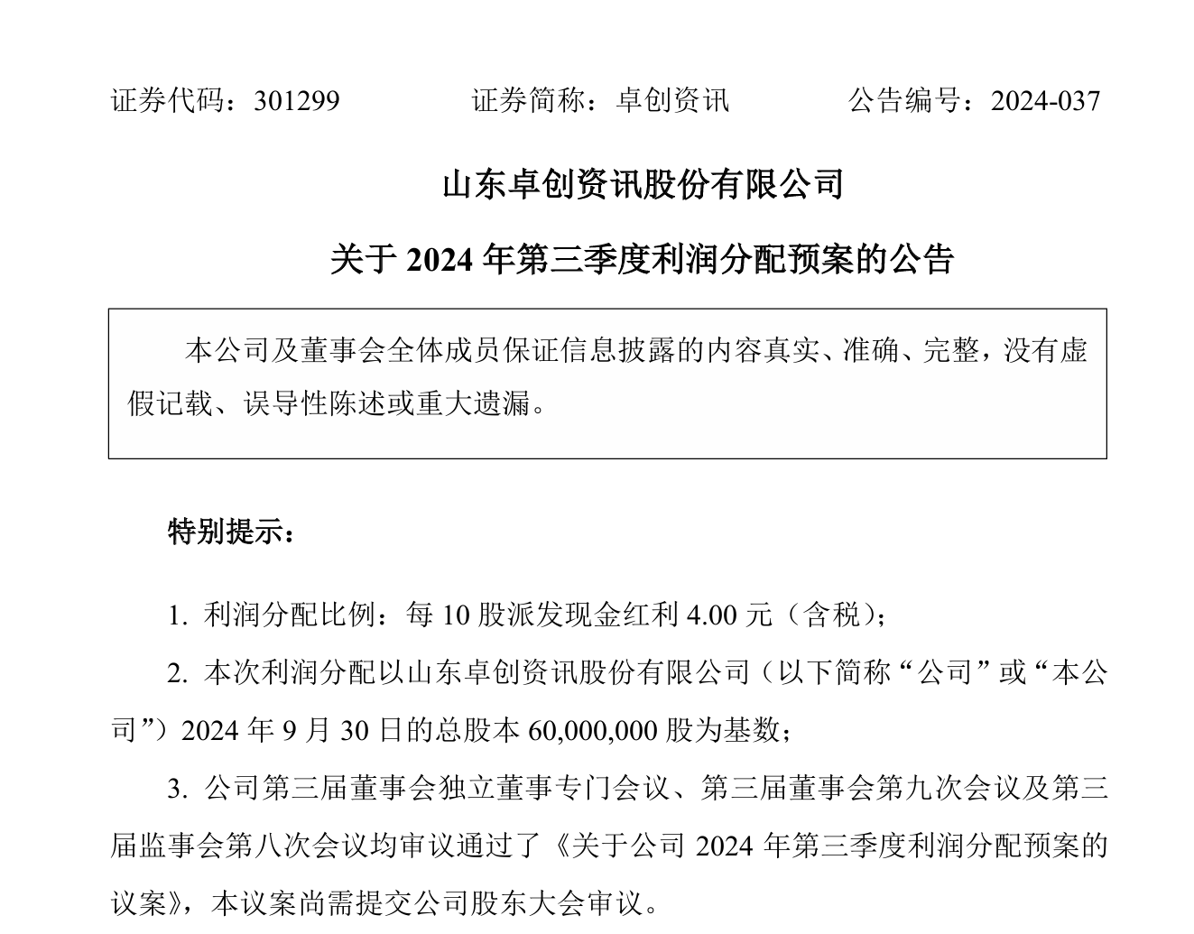 10月25日,卓创资讯发布关于2024年第三季度利润分配预案的公告。公告中称,2024年1至9月,公司实现归属于上市公司股东的净利润 5264万元,母公司实现净利润 5203万元。截至 2024年9月30日,公司合并报表累计未分配利润 1.2828亿元,母公司累计未分配利润 1.3亿元(以上财务数据均未经审计)。