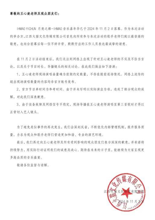 11月3日,王心凌宜春音乐节活动的主办方发布声明致歉,澄清现场演唱曲量确为前期约定数量,不存在提前退场的情况,网上流传的超出现场演出数量的内容均非官方发布。官方节目单时间为参考时间,且由于设备故障及网络信号不稳定,现场导播才在王心凌演唱至第三首歌时切入艺人镜头。