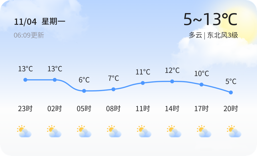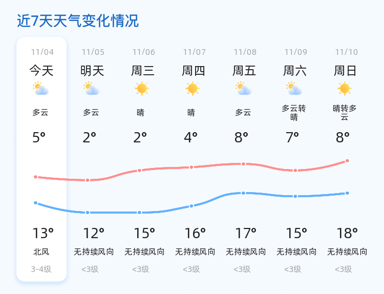 2024年11月4日,农历十月初四,聊城今日天气为多云,气温在5℃至13℃之间,东北风3级,空气湿度31%,PM2.5浓度为45微克/立方米,整体天气条件较为舒适,全市各区均以多云天气为主,温差适中,适宜市民外出活动。