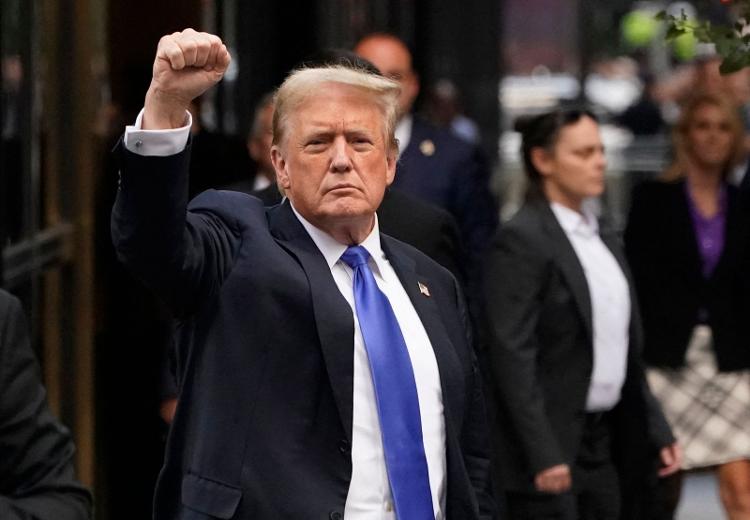 5月30日,美国纽约,特朗普在刑事审判中被判有罪后,回到特朗普大厦时举起拳头。