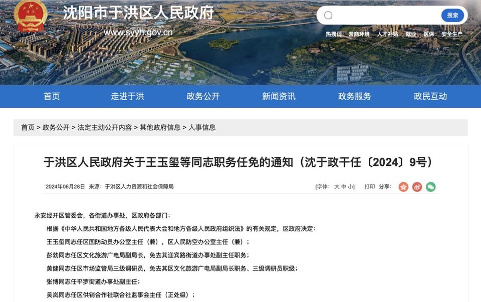 今年6月任于洪区文化旅游广电局副局长,免去其迎宾路街道办事处副主任职务。