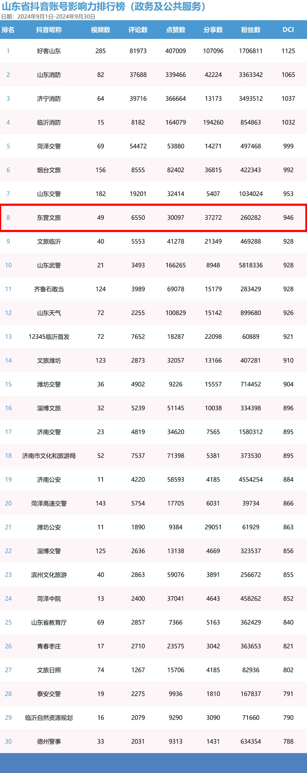 10月30日,山东省新媒体协会公示了2024年9月山东省新媒体影响力排行榜。东营市文化和旅游局的官方抖音账号“东营文旅”成功跻身《山东省抖音账号影响力排行榜(政务及公共服务)》,凭借946的DCI值(抖音传播指数)位列全省第八名,在地市级文旅账号中排名第二。“东营文旅”是东营市唯一一个上榜的抖音账号,这是继今年3月份上榜以来,“东营文旅”抖音号第二次进入《山东省抖音账号影响力排行榜》。