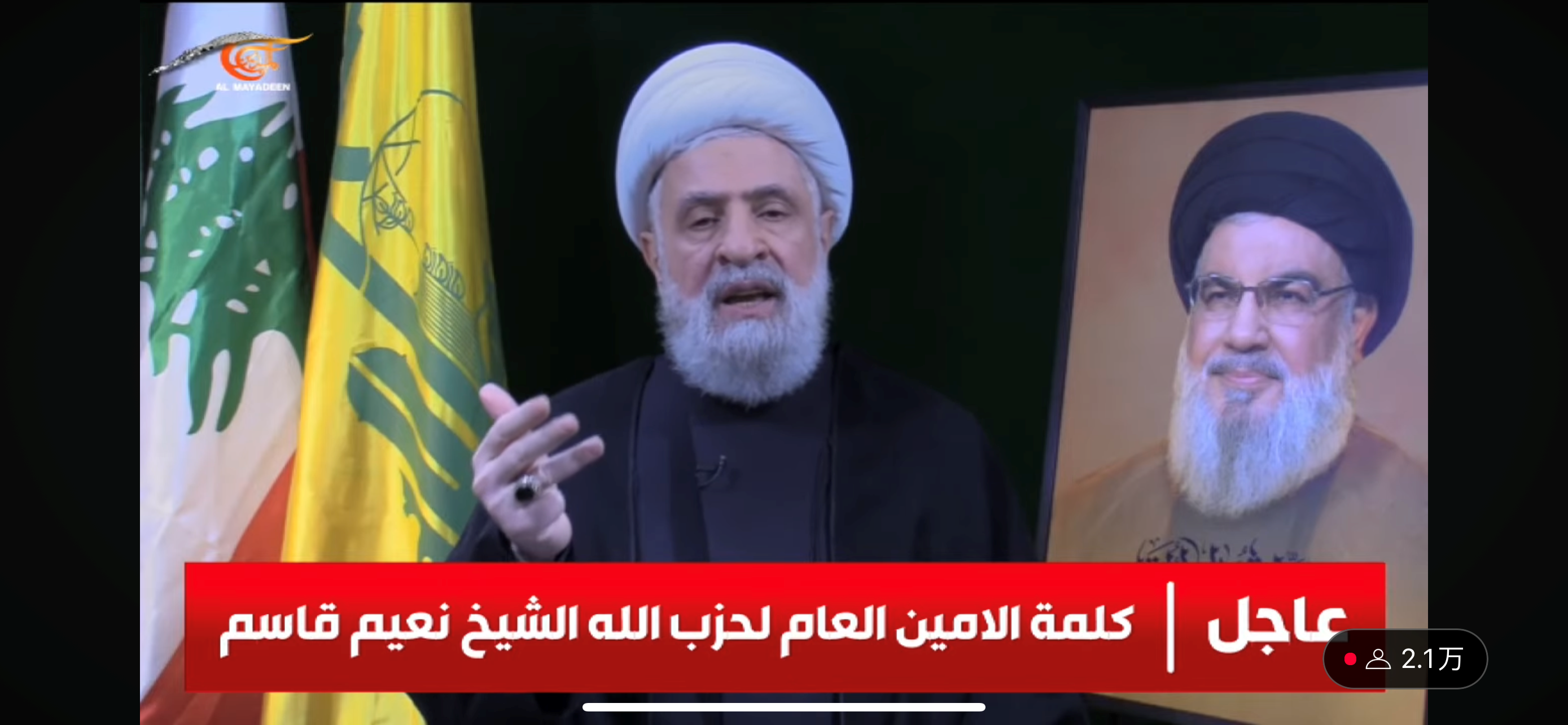 当地时间11月6日,黎巴嫩真主党总书记纳伊姆·卡西姆发表被任命为真主党领导人以来的第二次视频讲话。详情>>