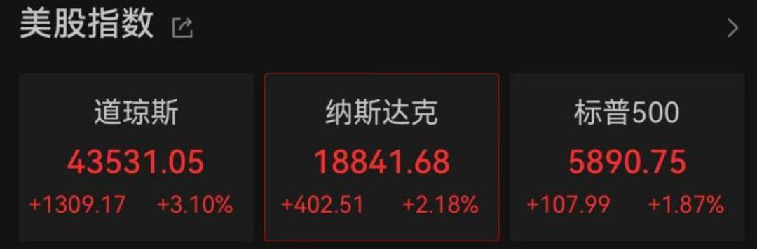 Wind数据显示,截至北京时间23:15,道指涨超1300点,涨幅3.10%;标普500指数涨1.87%,纳指涨2.18%。特朗普媒体科技集团股价涨超24%。详情>>