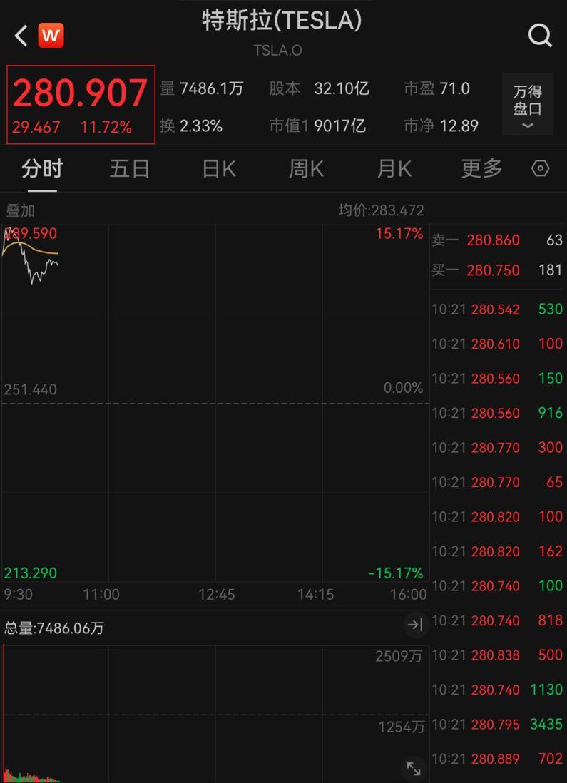 特斯拉股价最高涨15.17%。