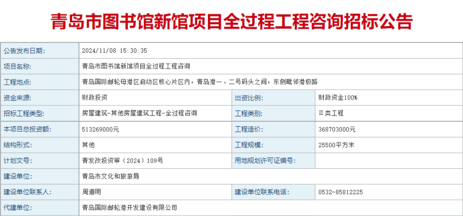 青岛市图书馆新馆项目的进展一直备受市民关注。近日,项目全过程工程咨询招标公告发布,工程地点位于青岛国际邮轮母港区启动区核心片区内,青岛港一、二号码头之间,东侧毗邻港极路,总投资约5亿元,建设单位为青岛市文化和旅游局,代建单位为青岛国际邮轮港开发建设有限公司。
