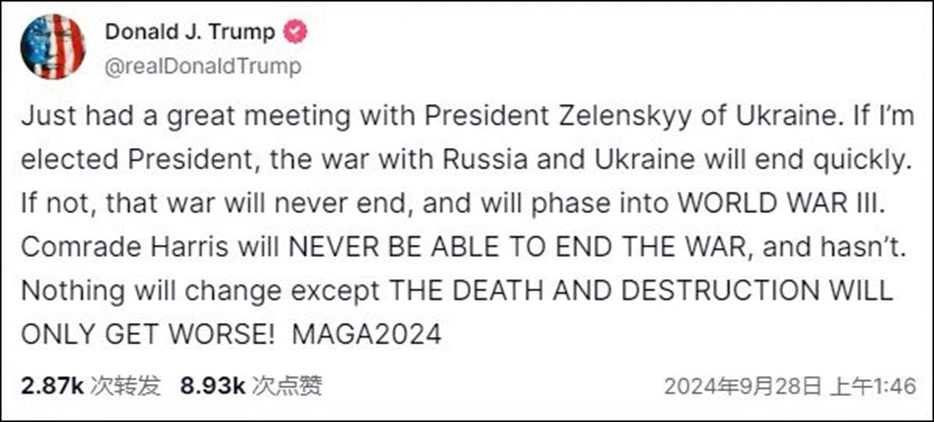 2022年2月24日,俄罗斯与乌克兰爆发了冲突。时至今日,双方仍然僵持。作为拜登政府的竞争者,特朗普多次对其进行了批评,并表示如果自己是总统,这些冲突都不会发生。在竞选时,他也多次声称“24小时内可解决俄乌危机”,并呼吁以色列总理内塔尼亚胡迅速结束加沙地带的冲突。